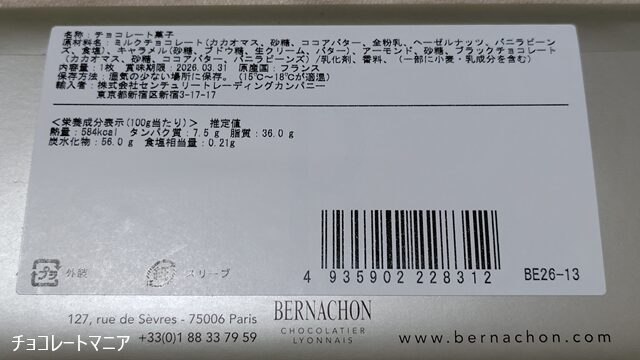 | 原材料 | ミルクチョコレート(カカオマス、砂糖、ココアバター、全粉乳、ヘーゼルナッツ、バニラビーンズ、食塩)、キャラメル(砂糖、ブドウ糖、生クリーム、バター)、アーモンド、砂糖、ブラックチョコレート(カカオマス、砂糖、ココアバター、バニラビーンズ)/乳化剤、香料(一部に小麦・乳成分を含む) |