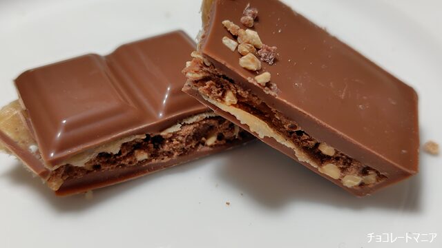 そのあとに現れるのが、バニラ風味のキャラメルの甘く香ばしい風味。キャラメルはとろけるように滑らかで、ミルクチョコレートのコクとよく合い、デザートのような贅沢さがあります。